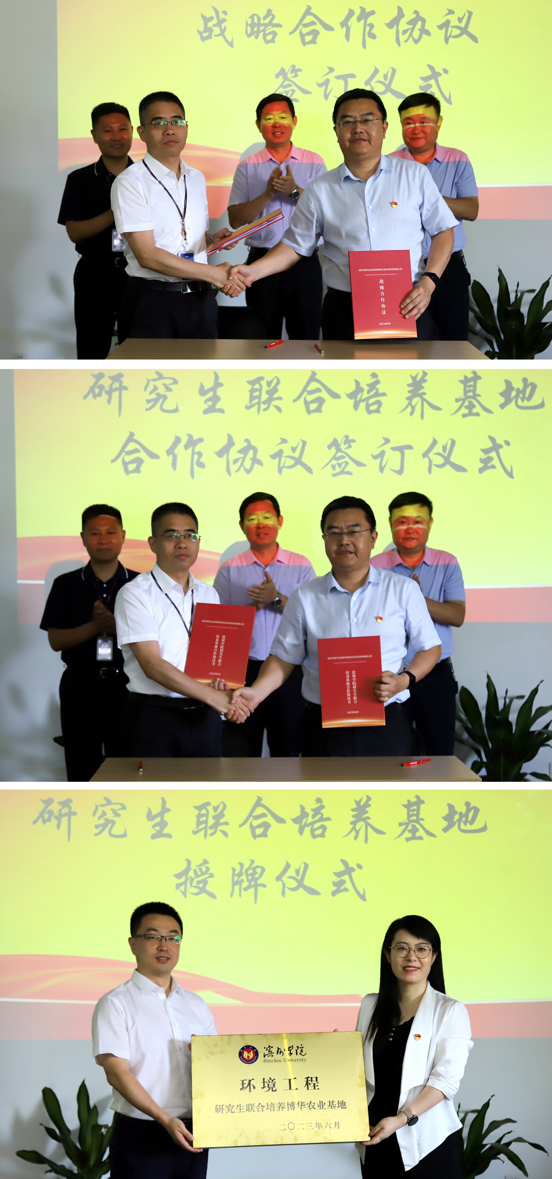 在與會人員的見證下,博華生態(tài)農(nóng)業(yè)與濱州學(xué)院黃河三角洲生態(tài)環(huán)境研究中心雙方簽訂戰(zhàn)略合作協(xié)議及研究生聯(lián)合培養(yǎng)基地協(xié)議,并為研究生聯(lián)合培養(yǎng)基地揭牌。